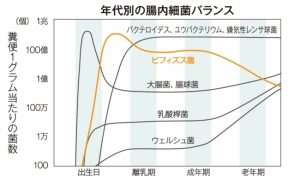 その後、離乳食が始まると再び劇的なフローラバランス変化が起こり、最終的にビフィズス菌は腸内細菌の1〜2割ほどに落ち着きます。